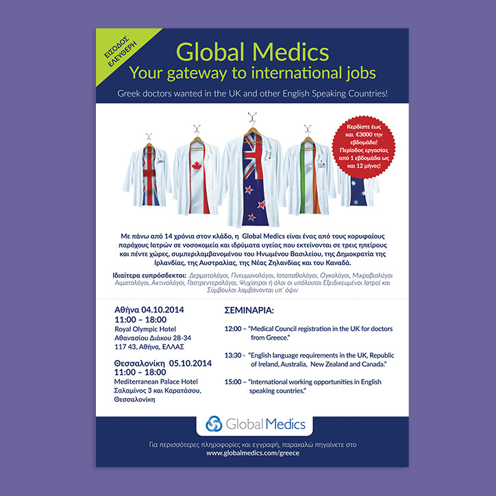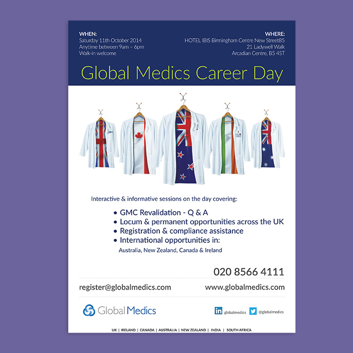 Projekt graficzny oraz przygotowanie do druku plakatów na Targi Pracy dla firmy Global Medics- Medical Recruitment Agency